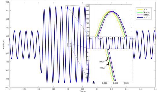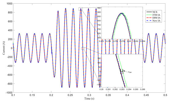Figure 11 and Figure 12 show that, with the new IA and DIM algorithms, the digital side waveform almost coincides with the NCS system waveform. Compared with the ITM IA, the waveform distortion is small, the accuracy is high, and the delay is small, not exceeding 8 μs. Considering the coexistence of various loads and the real-time change of impedance in the actual system, there is a little tracking error in impedance matching, making it impossible for the waveform of the DSS side to completely coincide with the NCS system. However, with the ITM algorithm, the waveform of the DSS side is significantly distorted compared with the new IA and DIM IA, and the accuracy is lower, due to the effects of interface delay and errors. The voltage and current waveform delays are about 68 and 71 μs, respectively.