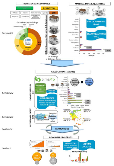 In this direction, the present work considers single-family houses that represent the largest segment (58%) of the existing building stock in Greece. Section 2 outlines the overall structure of the methodological approach. The first step is to define the typical SFH in order to identify the common construction materials, along with the assumptions for performing the operational and embodied energy calculations. The bill of materials and quantities set the priorities for the field work and the short energy audits for collecting relevant data from local manufacturing facilities. The tools used for the calculations include the national calculation engine for estimating the operational energy of the buildings, while the EE is estimated with a commonly used international tool and database that is also adapted with national data, if available from the field studies. Section 3 summarizes the main findings from the audits of local manufacturing facilities, along with other available national data for the embodied energy of materials and systems. The embodied and operational energy indicators are quantified for the different building typologies in the four national climate zones. The analysis concludes with an assessment of the energy recovery time to account for the embodied energy by the operational energy savings resulting from the implementation of energy conservation and efficiency measures. Section 4 elaborates the main findings of the work reported herein and its limitations. Finally, Section 5 outlines future work and priorities.
