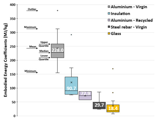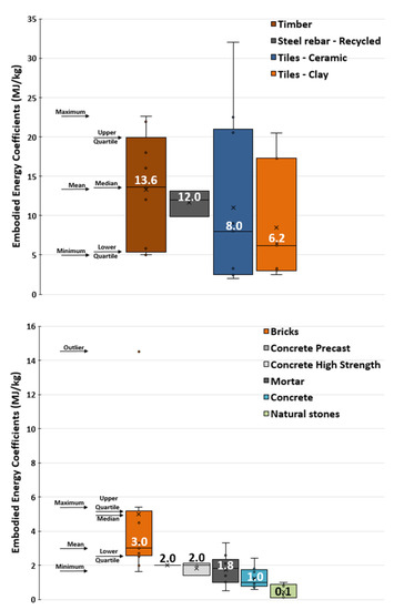 Embodied energy coefficients from eleven public sources with cradle-to-gate data are summarized in Figure 2. The specific numerical values and detailed references are presented in [29]. The scales of the y-axis in Figure 2 for the different group of materials are purposely different so that the whisker plots can display in detail the data distribution through their quartiles. The median value of the coefficients is included inside the box for each material. The width of the box shows the interquartile range between the lower 25th and the upper 75th quartile, which in most cases illustrates a large data spread out. The observed differences may originate from discrepancies in the boundary definition used in the calculation method, the national origin of the data used in the analysis, the differences in production processes that may be relevant for some materials or products, etc. As a result, some claim that since the reported embodied energy coefficients vary so much across among various studies, it may not be appropriate to simply adopt these values and use them for national calculations or comparative studies [10].