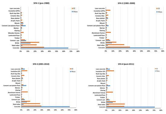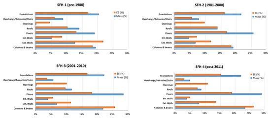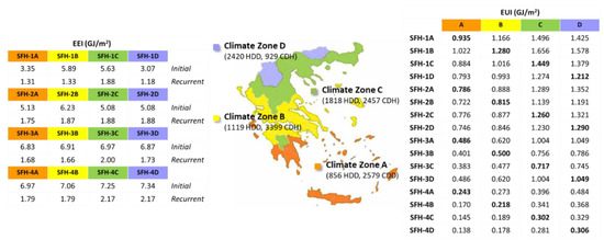 Initial work that exploited an adapted Hellenic dataset for commonly used construction materials in Greece considered only four typical SFH to estimate their EE intensities that ranged from 3.2 GJ/m2 to 7.1 GJ/m2 [37]. This is significant when compared with the annual primary EUIs that range for the most recent building construction under the stringent national energy code from 0.3 to 0.5 GJ/m2 in the different climate zones of Greece, or relatively less important if one considers the older pre-1980 dwellings that have high EUIs that range from 1.9 to 3.9 GJ/m2 [38]. The present work extends previous efforts by considering 16 case studies providing a comprehensive representation of the Hellenic residential typologies for single-family houses, for characteristic building construction periods and locations in the four climate zones in Greece.