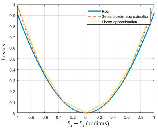 Equation (12) represents the losses of active power in the lines. For small differences between and ( (13) is a good approximation for (12) [25]. In turn, the second order expression for (12) can be approximated as the sum of linear equations, as shown in (14) and Figure 1.