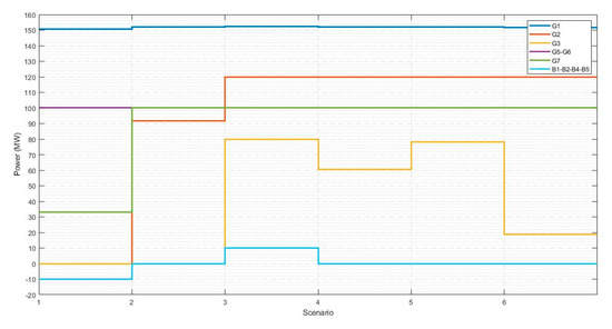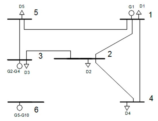 For the Garver 6 node test system presented in Figure 2, the problem to be solved is to establish the equilibrium point between the power delivered by the generators and BESS (suppliers of the electricity market) and the power demanded by the loads and BESS (Demands in the electricity market). The system has 10 generation units that have a cost associated for each dispatched MWh. The loads associated with the system are presented as the sum of five demand blocks. The nodes to which the generation and load units are connected are presented in Figure 2.