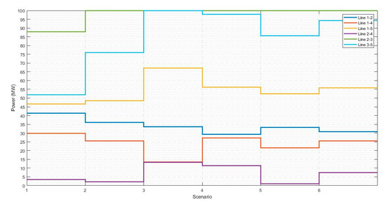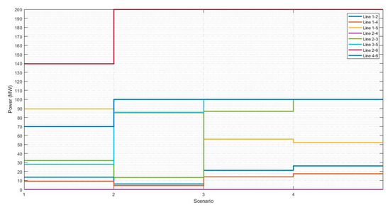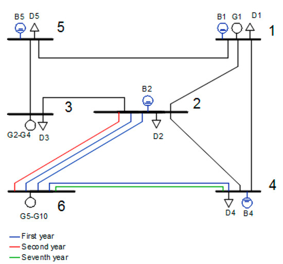 From the results developed in GAMS, it is observed that the added social benefit is maximized when three lines are built in the expansion process, two lines between nodes 2–6 and one line between nodes 4–6. Figure 3 shows the power flows through the lines. With the entry into operation of the lines from node 6 to nodes 2 and 4, respectively, the generation connected to node 6 supplies the maximum power that the restrictions for the thermal capacity of corridors 2–6 and 4–6 allow. After the expansion of the system, node 6 supplies 47% of the energy consumed in the network.