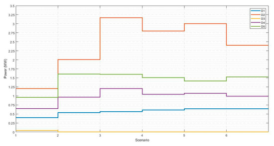 The equations presented in (28) and (29) consider the capacity and the maximum demand for the generators and the loads, respectively, while (30)–(32) establish the relationship between the stored energy and the flow of power in the batteries, for each of the scenarios as defined in Section 2. Finally, (33)–(36) establish the limits for the variables defined in the linearization process of the losses