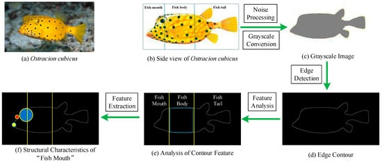 Edge detection usually uses convolution and similar methods to detect the edge by capturing the maximum value of the gradient in the image by using the gray jump of the image at the edge. There are a large number of black and green spots on the Ostracion cubicus. The focus of this investigation is the streamline contour body edge of the Ostracion cubicus rather than the contour of the internal spots. The original image must be processed with noise and converted to gray scale before edge detection (Figure 1c). Then Canny edge detection was used to extract the edge contour and get the Ostracion cubicus contour (Figure 1d) [28]. From Figure 1e, we can distinguish the structural characteristics of Ostracion cubicus more intuitively. The section of the “fish body” is approximately rectangular, which can be compared to the box girder.