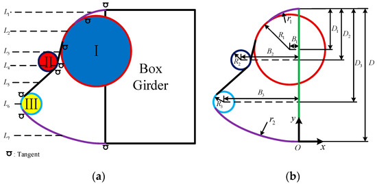 As Figure 2a shows, the streamline structure design parameters of the Ostracion cubicus “fish mouth” are the location and radius of characteristic circles (circle , and ). According to the three feature structures, the curve of “fish mouth” structure can be divided into seven line segments (–). Each line segment is tangent to their neighbors, where are arcs and are straight lines. () is a circular arc, one end of which is tangent to circle (), and the other end is tangent to the flange plate of the box girder. The characteristic parameter setting of the “fish mouth” structure is shown in Figure 2b. Take the joint between the “fish mouth” and the bottom of the “fish body” as the coordinate origin (), the direction from the fish mouth to the tail is the axis, and the direction from the bottom of the fish body to the top is the axis. The center positions and radius of circles , and are the initial characteristic parameters (B1, B2, B3; D1, D2, D3; R1, R2 and R3). The radius () of () is the intermediate parameter, which can be calculated by the geometric relationship between line segments.