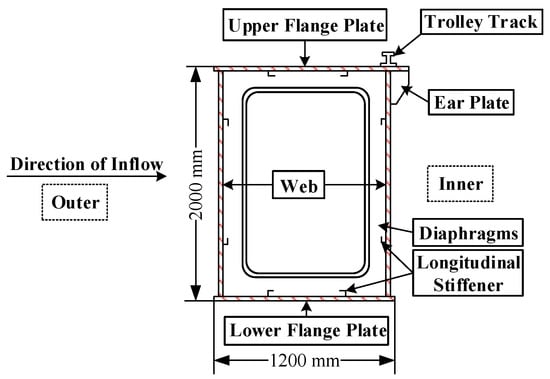 Figure 3 shows the structural diagram of a 40 t gantry crane box beam. The box girder of gantry cranes is mostly the rectangular cross-section, which is mainly composed of upper and lower flange plates and webs on both sides. The inner part is set with diaphragm and longitudinal stiffeners to enhance the local stability of the box girder, and a trolley track is installed on the top of the upper flange plate. The spreader, wire rope of the crane lifting mechanism will run in the space outside the inner web of the box girder. Generally, no functional mechanism is installed outside the outer web of the box girder. Therefore, the utilization of the outer space of the windward web (outer web) will not affect the operation of the mechanism.