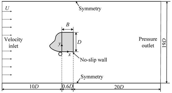 The geometry of the flow domain and boundary conditions are shown in Figure 5. The bionic attachment cylinder was set in the Cartesian coordinate system, and the -axis was in the same direction of inlet flow. The height of the cylinder (D) was equal to 1 m and all dimensions were based on this parameter. The width of the rectangular cylinder (B) was equal to 0.6 D.