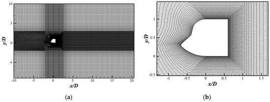 Figure 6a shows the non-uniform grid of the cylinder, and Figure 6b is the detailed enlarged view of grid division around the cylinder. The orthogonal grid was used in the calculation, and densification around the cylinder with the O-block grid. The calculation used the PISO (Pressure Implicit with Splitting of Operators) algorithm. Firstly, the flow around a rectangular cylinder with side ratio of 0.6 was calculated at Re = 6.85 × 105. Three sets of grid models with different density (G1, G2 and G3) were established to calculate the flow around the rectangular cylinder with a width height ratio of 0.6. Then the calculation results were compared with the reference values to ensure the accuracy of the numerical simulation. Numerical results are shown in the Table 3.