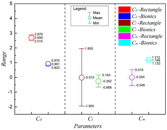 The amplitude of aerodynamic coefficient represents the oscillation of the aerodynamic force on the structure, which is related to the wind-induced vibration and impact of the structure in the flow field. The amplitude was equal to half of the difference between the maximum and minimum values of the parameter. The amplitude of the lift coefficient with the bionic attachment structure was reduced from 1.95 to 0.416 (decreased by 78.67%), which means that the bionic attachment structure had better stability in the flow field. Similarly, the amplitudes of drag and torque coefficients (, ) were also greatly reduced, which were 59.3% (from 0.182 to 0.074) and 95.2% (from 0.532 to 0.040), respectively.