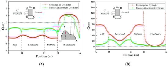 Figure 8a presents the time-average pressure coefficient (Cp,avg) around the two structures. The transition position from the positive to negative values of Cp,avg represents the separation point of the boundary layer. On the windward surface, the boundary layer separation points of the rectangular cylinder were around A and D, while those of the bionic attachment cylinder were at and (see in Figure 2a). The moving forward of the boundary layer separation points reduced its width and weakened the blocking effect of the structure on the fluid. Cp,avg of the top-surface was negative, and the value of the bionic attachment cylinder decreased. The bottom and leeward surface showed the same trend.