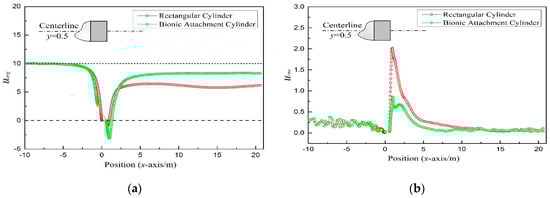 The distribution of time-average stream-wise x-velocity (uavg) along the centerline of the structure is shown in Figure 9a. The centerline is a line along the x-axis in the middle of the structure (y = 0.5 m) of the flow field. For the rectangular cylinder, uavg stagnated at zero on the windward side of the structure, and transited from negative to positive on the leeward side. Compared with the rectangular cylinder, the transition point was further to the leeward side, which meant that the wake vortex was further to the leeward side. In the wake far away from the structures, uavg of the bionic attachment cylinder was larger and closer to the inlet velocity (U = 10 m/s). This meant that the obstruction of the bionic attachment structure to the fluid was reduced, and the energy of the wake was enhanced. The root-mean-square velocity (urms) represents the fluctuation intensity of velocity. urms of the rectangular cylinder had a large peak behind the leeward side, while urms of bionic attachment cylinder was low and stable (Figure 9b). It shows that the streamline shape of bionic attachment structure has less influence on the flow field.