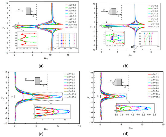 It can be seen from Figure 10a,b that the wake time-average velocity decreased as the distance increased. The wake region affected by the flow around the bionic attachment cylinder was narrower and shorter (see in particular enlarged drawing ). It shows that the bionic attachment structure had little effect on the flow field of the tail. The multi peak of the curve shown in enlarged drawing indicates the existence of vortices. The wake vortex of the rectangular cylinder was disappeared after x/D = 0.3, while that of the bionic attachment structure was disappeared after x/D = 1.6.
