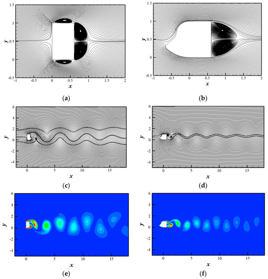 Figure 11 gives the flow visualization images of the two structures flow field evolution. The time-average streamlines boundary layer separation occurred at both ends of the windward side of the rectangular cylinder, and reattachment was formed at the tail of the cylinder. Vortices were formed at the top-leeward-bottom surface of the cylinder (Figure 11a). For the attachment structure, the boundary layer separation occurred on the windward side, flowed along the top and bottom surface and separated from the ends of the leeward side of the structure. Compared with the rectangular cylinder, the wake vortex of the attachment structure was more backward, which was consistent with the results in Figure 9a. From the instantaneous streamline contours of Figure 11a,b, it can be found that the bionic attachment structure flow field was more stable. The vortex shedding began at both ends of the windward side of the rectangular cylinder (Figure 11c), and the width of vortex street was wider than that of bionic attachment structure (Figure 11d). For the attachment structure, vortex shedding appeared at the ends of the leeward side, and the vortices became smaller and more numerous (see in Figure 11e,f).