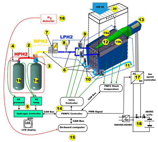 Gaseous hydrogen is stored in two composite cylinders and supplied directly to the PEMFC stack. The efficiency