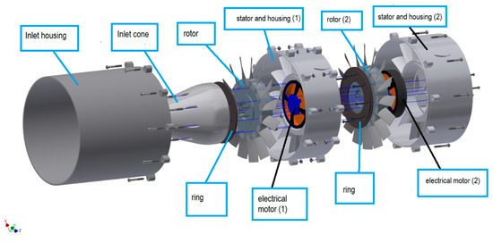 Figure 16a presents the estimated power consumption needed for the operation of two cascade axial fans with different rotation speeds (
