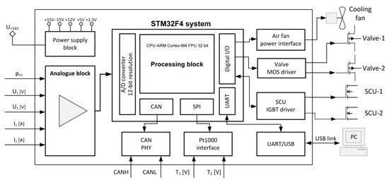 Figure 3. Data on modular PEMFC stacks involving SCU units and their impact on performance are limited. In the constructed V-type PEMFC, the SCU process can be implemented in two different ways: the SCU can either occur simultaneously in modules (A) or (B) or be staggered. The use of two SCU systems, 1 and 2 (causing short-term short circuits of the PEMFC stack for purposes of self-healing), enables control of the short circuits so that they occur at maximum intervals relative to each other during the operation of the stack, thus preventing a sudden voltage drop to 0 V in the output of the PEMFC module, which might be unfavourable for all devices in the propulsion system. In addition, purification of the anode space via periodic (every 10 s) opening of the H