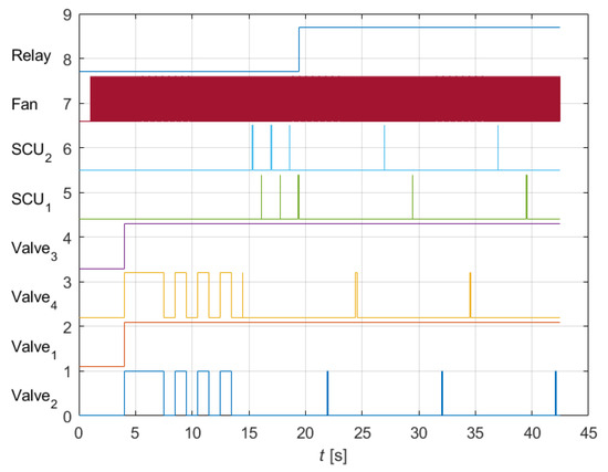Increases can also be observed in hydrogen flow rate between short circuits, associated with the opening of the solenoid valves at the hydrogen outlet from the anode spaces of fuel cell modules A and B, described as Purge 1 and Purge 2. Hydrogen flow during the operation of the electricity generator with the fuel cell stack equalled 123 Ndm3 H2/min; during the operation of the SCU1 and SCU2 systems and the opening of the Purge 1 and Purge 2 flushing solenoids, this value temporarily increased to 140–150 Ndm3 H2/min. It was estimated that hydrogen consumption increases by 4–8% during SCU and purge operation.