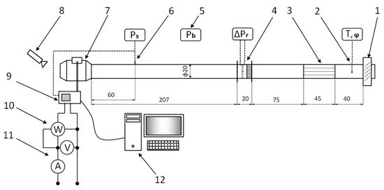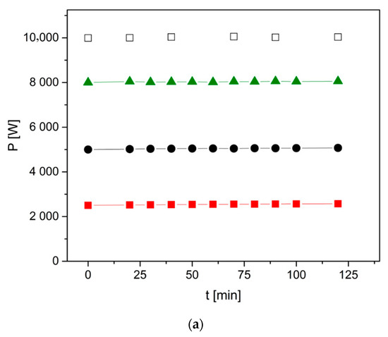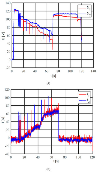 Figure 10a presents an example of a test examining the variation in electrical parameters such as voltage (U), current (I), and electrical power (P) vs. time.