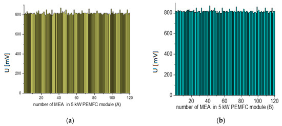 Figure 7a,b presents the distribution of the voltage recorded for single MEA fuel cells in the PEMFC assembled module (A) or (B). The electrical load 10 A was applied.