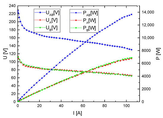 It was also found that no differences in electrical performance were observed for both modules used for construction of the V-type PEMFC stack. The analysis of these curves also indicated that PEMFC stack (A) and (B) exhibited slightly higher power than the assumed 5 kW. This fact allowed for a short-term application of an electrical load that may be slightly higher than 10 kW. Based on these results, the nominal power of PEMFC stack is established for 10 kW for continuous application in the PEMFC-based power source.