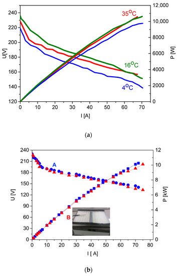 Figure 9a presents the U-I and P-I curves recorded in different measurement conditions. It can be seen from the U-I curve that the open-circuit voltage (OCV) of the PEMFC stack was ~230 V DC. As the current increased, the voltage decreased linearly to approximately 154 V at 67 A. The electrical power of the 10 kW PEMFC stack reached more than 10 kW in all investigated conditions. In all cases, the power output of the PEMFC stack slightly exceeded 10 kW, although the variation in final performance was no more than 5–7% in comparative analysis. At lower temperatures, such as ~4–10 °C, values obtained from the first run of the stack were lower. The application of a slow electrical load with a current of 5–10 A for 5–10 min enabled the attainment of good performance levels in 2 or 3 runs. All of these experimental data indicated that the constructed V-type PEMFC stack was capable of achieving the assumed nominal power of 10 kW in various conditions. The impact of ambient conditions on PEMFC stack performance is important for practical applications of these stacks as power sources for various devices.