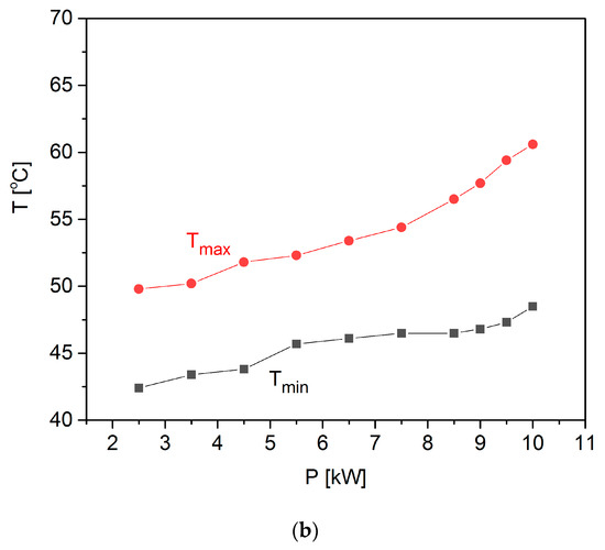 Figure 13b,c, the temperature increased when the stack operated with higher electrical power. The maximum temperature of the stack with 10 kW of power was ~60 °C. Increases in temperature were observed for sensors T1, T5, T10, and T14, i.e., the points farthest from the air outlet channel of the constructed stack. The lowest temperatures were recorded by T3 and T8, the points near the outlet channel. The temperature difference ΔT between the minimum and maximum recorded temperatures increased with increasing loads, reaching values of approximately 12–13 °C in the measurement conditions corresponding to