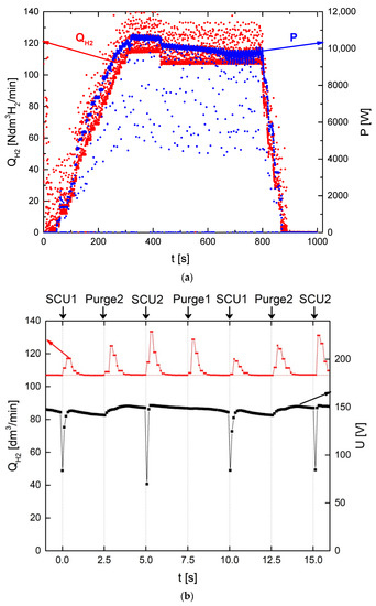 Figure 10a,b). The experiments were carried out for 2 h. During PEMFC performance, an elaborated procedure of purging and SCU was applied.