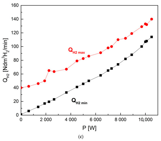 Figure 11c presents the representative hydrogen dependence of intensity of hydrogen flow measured during the operation of a PEMFC stack on declared electrical power. The highest flow rate of hydrogen was estimated at ~140 m