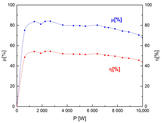 Figure 7a presents the variation of electrical efficiency vs. the power produced by the constructed V-type PEMFC stack. As can be seen, electrical efficiency close to 50% is observed within a power range of 1–7 kW; following attainment of 8 kW, a small decrease was observed. At 10 kW, electrical efficiency was close to 45%. This value is close to that indicated in all data existing in the literature regarding an air-cooled PEMFC stack.