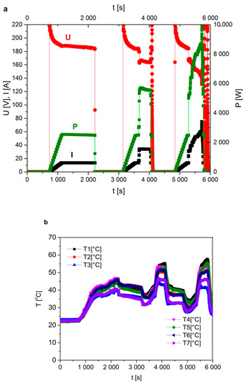 The first run of the constructed V-type PEMFC stack was conducted immediately after supplying hydrogen to two modules. After 750 s, when the PEMFC stack was initiating operation, the current load increased with a ramp of 1 A per 30 s to achieve electrical power of 2.5 kW (one-fourth of nominal power) in conditions characterised by current (I) = 13.5 A and voltage (U) = 183 V; the PEMFC stack operated in these conditions for no longer than 1000 s. Subsequently, the investigated power source was turned off. When turned on a second time, the assumed electrical load of the PEMFC stack rose to 5 kW. After the power source was turned on again for 3200 s, the current (I) load increased with a ramp of 1 A/30 s until it reached 13.5 A and P = 2.5 kW. At t = 3800 s, an increase in the current to 5.5 kW (164 V, 34 A) was reached. This load was continued up to 4100 s. Subsequently, the PEMFC stack was turned off again. In the third test, at t = 4800 s, the electrical current load also increased with a ramp of 1 A/30 s, to 2.5 kW, and again at 5300 s to 5.5 kW (164 V, 34 A). At t = 5600 s, the power source reached the nominal power of 10 kW (130 V, 75 A).