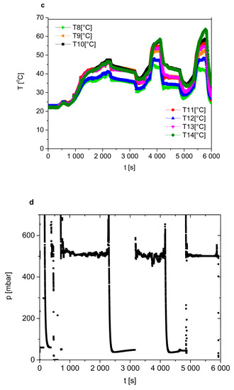 Figure 10a, a slow increase in electrical power was noted during the applied experiment within the range 2.5–5 kW. Within a range of 6–10 kW, a fairly stable level of power was produced by the stack. In