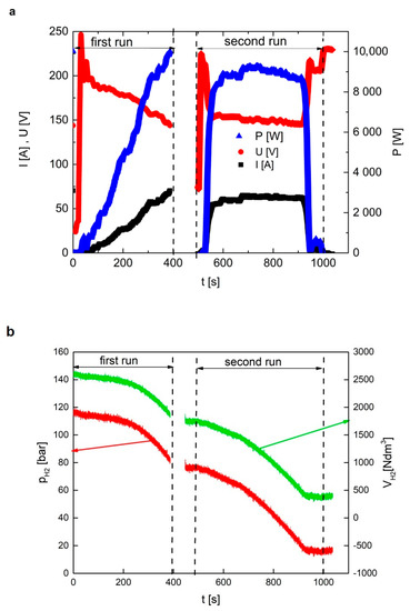Figure 14a. In the first part of the experiment (from 0 to 400 s), the hydrogen pressure varied between 120 and 80 bar due to the utilisation of hydrogen in the fuel cell stack. In these conditions, the electrical load of the stack was increased from 0 to 10 kW and the stack was turned off. During the second part of the experiment (450–1000 s), hydrogen pressure varied between 80 and 20 bar due to the utilisation of hydrogen for performance of the stack with 8 kW of power. Analysis of variation in the hydrogen volume, which was stored in two composite cylinders and then utilised during the operation of the stack within the period of time under consideration, was also carried out. In the case of operation of the stack under 9–9.5 kW, which took place over a period ranging from 9 to 14 min, the consumption of total hydrogen was calculated about 145 dm