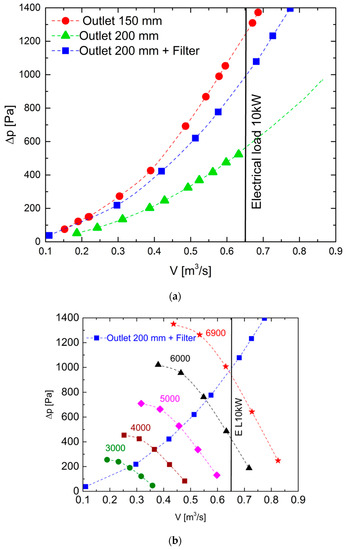 Figure 15a presents the dependence of total pressure losses (Δp) vs. volumetric flow rate (V) determined for the cooling system (whose experimental setup is presented and explained in