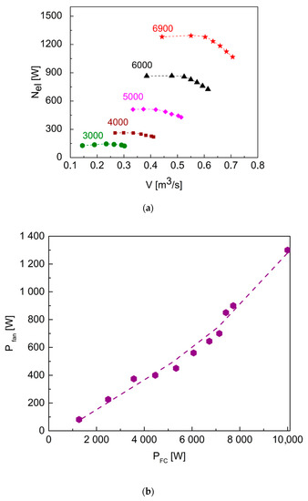 n). As can be seen, during operation of a PEMFC stack at nominal power of 10 kW, 1.2–1.3 kW is required to run cooling fans at a rotation speed of 6900 rpm.