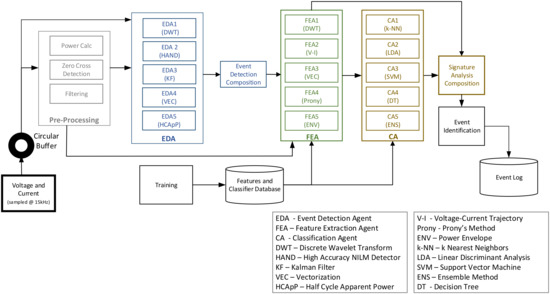 2], a Multi-Agent System is defined as “a loosely coupled network of problem-solving entities (agents) that work together to find answers to problems that are beyond the individual capabilities or knowledge of each entity (agent)”. In this sense, the proposed architecture has multiple load event detection agents, feature extraction agents, and load classification agents. Each of these agents works autonomously, examining the data collected from the voltage and current sensors. Their findings are then combined to obtain more accurate results than what is achieved by any individual agent.