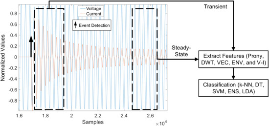Once a candidate event is detected, the FEAs examine the samples in the circular buffer to extract relevant transient and steady-state features. Five feature extractors, based on steady-state, transient and their combination, were selected: (i) V-I trajectories (V-I); (ii) Prony’s Method; (iii) Energy Levels of Discrete Wavelet Transform; (iv) State information from Vectorization; and (v) Power Envelope method. The identification of loads can be accomplished using machine-learning-based classification agents (CA). Five machine learning methods were evaluated: (i) k-Nearest-Neighbors (k-NN); (ii) Linear Discriminant Analysis (LDA); (iii) Support Vector Machine (SVM); (iv) Decision Tree (DT); (v) Ensemble (ENS). These methods are all based on supervised learning, which means that all the class labels are known and previously defined during the training process. Hence, a database of load features and trained classifiers supports the identification process, as presented in
