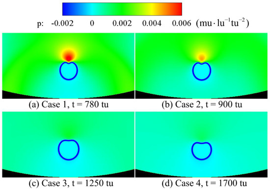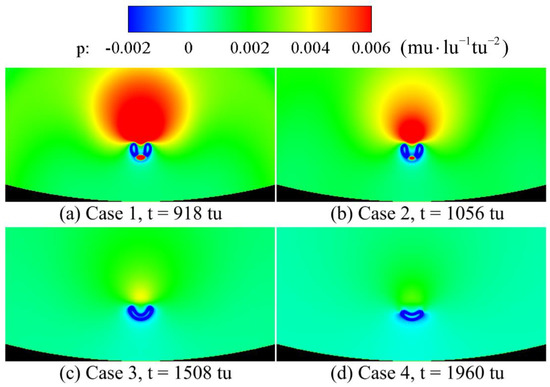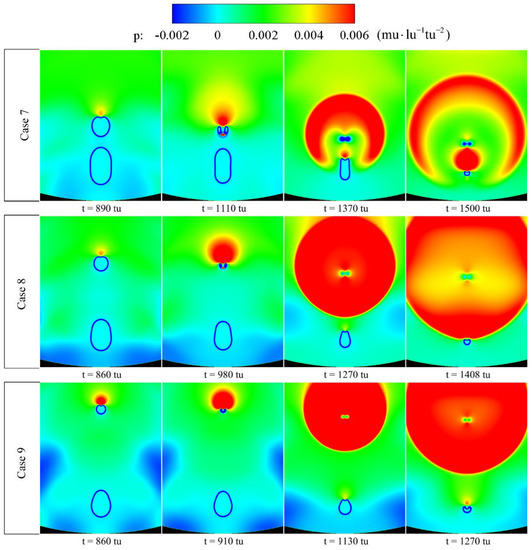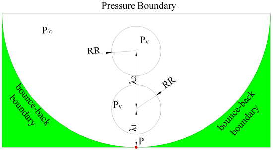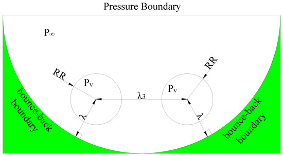 - When the double cavitation bubbles are arranged horizontally, the mutual effect between the cavitation bubbles gradually decreases, as the relative distance of the cavitation bubbles increases. The depression position of cavitation bubble gradually moves from the lower part to the upper part, as the relative distance increases. In Case 11, the cavitation-bubble collapse from the middle of the bubble under the interaction between cavitation bubbles and the influence of the wall on the bubbles. After the collapse, the pressure in the vortex zone increases accordingly, as the relative distance of the cavitation bubbles increases.