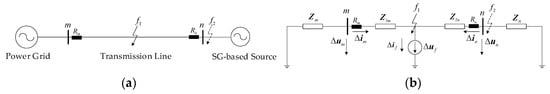 , = equivalent impedance of the SG-based sources at busbar m and busbar n respectively.