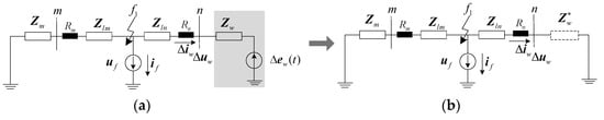 The fault component network of a transmission line connected to a DFIG-based wind farm is depicted in Figure 2a. The major distinction between and Figure 1 and Figure 2a lies is that an additional time-varying potential component () is introduced into Figure 2a. The reason for this phenomenon is that, since DFIG is comprised of nonlinear power electronic devices with a fast response characteristic, its equivalent internal potential cannot maintain constant in the pre-fault and post-fault condition. In this situation, the equivalent impedance at the backside of Rn in the fault component network is not the real impedance of DFIG (), which is defined as the superimposed impedance of DFIG in this paper. Furthermore, based on the conventional fault component extraction algorithm, the positive- and negative-sequence superimposed impedance of DFIG can be represented in the corresponding fault component network by Equations (5) and (6), respectively, i.e.,