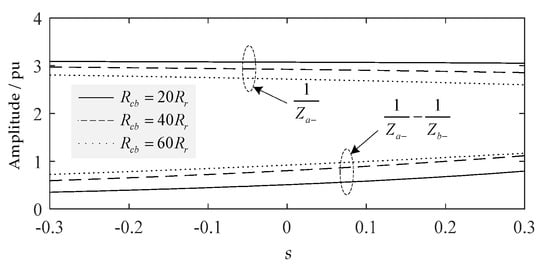 Equation (19) shows that is also composed of three parts. After transforming into the stationary synchronous reference frame, Part I is the fundamental frequency component, Part II is the decaying DC component, and Part III is the slip-related frequency () component. However, there is a major distinction between and . Based on the parameters of a typical DFIG given in Table A1 in Appendix B, the amplitude relationship between and is depicted in Figure 3. To prevent the rotor from an overcurrent, is generally set as dozens of times ; then, it can be seen that the amplitude of is significantly smaller than that of , which indicates that the slip-related frequency component in Equation (19) can be ignored. In this situation, after extracting by the Fourier algorithm, in Equation (19) can be simplified as follows: