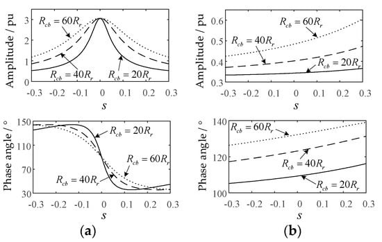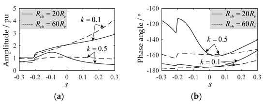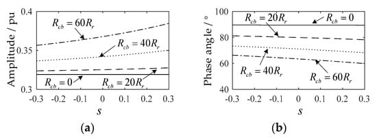 From Equation (25), it can be learned that the characteristics of is only determined by two factors: and . Accordingly, the amplitude and phase angle characteristics of are shown in Figure 9. As can be seen, since the frequency of the slip-related component is , the change of has a tiny effect on and the characteristic of is mainly affected by . Moreover, with the increase of , the amplitude and phase angle of increase and decrease, respectively. However, the phase angle of is always between 0° and 90°.