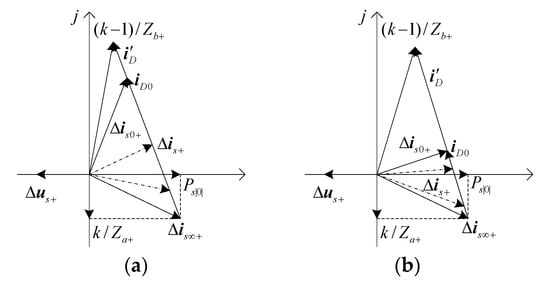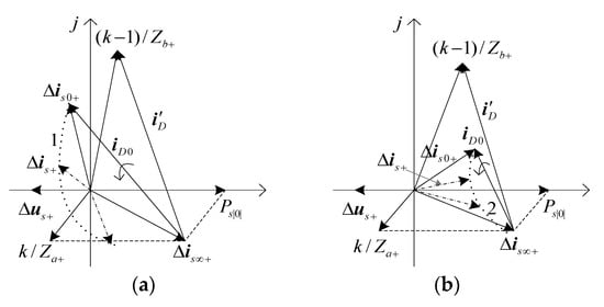 Given all the above considerations, the vector diagrams of with different can be plotted as Figure 5, Figure 6 and Figure 7 for , , and , respectively, and the characteristics of can be analyzed in three stages: the fault initial stage, the fault transient stage, and the fault steady stage.