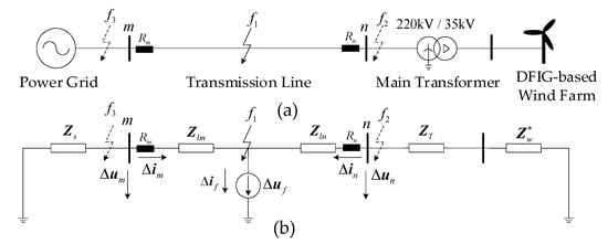 Benefited from the above definition, Figure 2a can be equivalent to Figure 2b and then has a similar structure as the fault component network of the SG-based system. As aforementioned, the FCBDR depends on the phase comparison to differentiate the forward and reverse fault. Therefore, the fundamental premise required from the FCBDR is that the fault component network is with the unified phase angle property. However, as shown in the following contents, the superimposed impedance of DFIG cannot be regarded as pure induction during the fault period due to the influence of low voltage ride through (LVRT) control schemes. Consequently, the performances of the related FCBDRs are shown negatively impacted by the fault behaviors of DFIG.