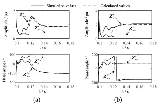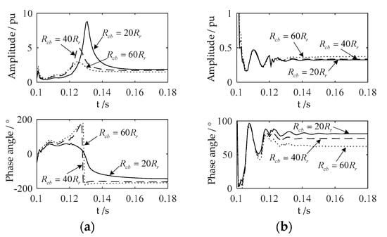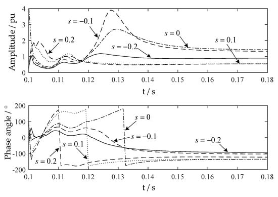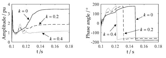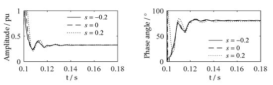 Case 3: The characteristic simulation results of and in Case 3 are shown in Figure 17a,b, respectively. As shown in Figure 17a, since in this case, the amplitude of fluctuates obviously during the fault transient stage. Moreover, when , the phase angle of decreases gradually from the initial phase angle and then passes through 0° to become a negative angle; while when or , the phase angle of increases gradually from the initial phase angle and then passes through 180° to become a negative angle, which matches the analysis results of Figure 5a,b. As shown in Figure 17b, with the increase of , the amplitude and phase angle of increases and decreases, respectively, which also match the theoretical analysis.