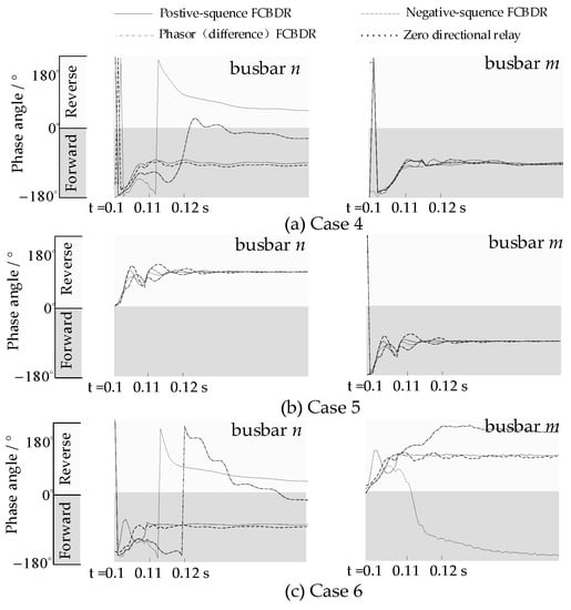 The performances of each conventional FCBDRs equipped at busbar n and busbar m are shown in Figure 18. In Figure 18, the forward and reverse identification regions for the FCBDRs are marked with the shadow regions according to Equations (3) and (4).