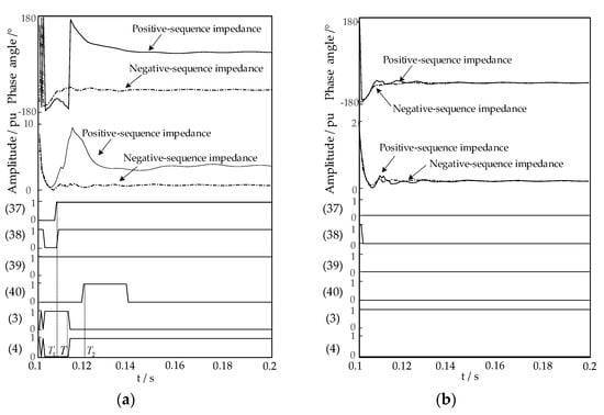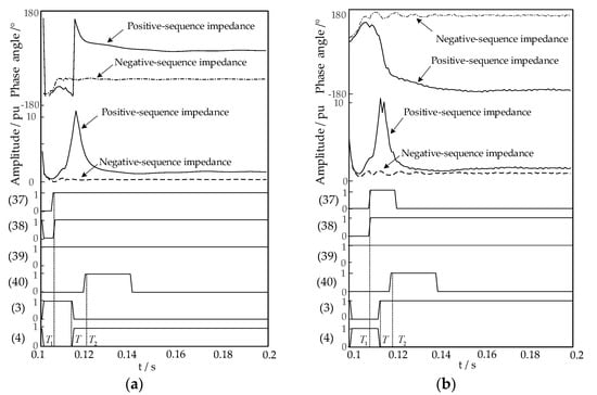 Case 6: The direction identification results of the supplementary direction criteria and the positive-sequence FCBDR are shown in Figure 21. In this case, the superimposed impedance of DFIG is included in both the measured impedances of the busbar m- and n-side positive-sequence FCBDR. As a result, it can be seen in Figure 21 that the positive-sequence FCBDR at two ends can only work correctly in a short time after the fault (). For the supplementary direction criteria at busbar n, as shown in Figure 21a, Equation (39) always has a stable output during the fault and Equations (37) and (38) identify the forward fault direction at and maintain a stable output thereafter. Moreover, Equation (40) switches the output at and maintain a stable output due to the use of the self-hold circuit. According to the operation logic of the proposed mitigation countermeasure at busbar n, the forward direction fault can be reliably identified during the whole fault period. For the supplementary direction criteria at busbar m, as shown in Figure 21b, Equations (38) and (40) have a stable output after , and Equation (39) have a stable output after . According to the operation logic of the proposed mitigation countermeasure at busbar n (see Figure 12b), the reverse direction fault can be reliably identified during the whole fault period. To observe the improvement more clearly, the operation results of FCBDR with and without the proposed countermeasures are shown in Figure 22.