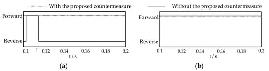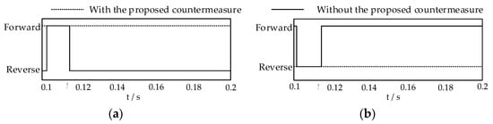 Operation results of the directional relay with and without the proposed countermeasure in Case 6: (a) busbar n; and (b) busbar m.