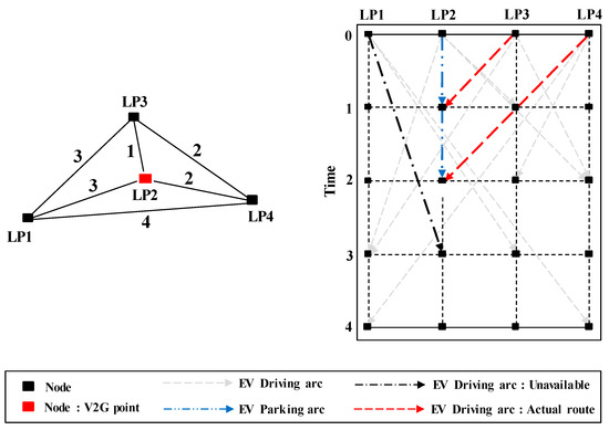 A TSN model G consists of a nodes and arcs set ( Ω n , Ω a ) . Here, the arc is divided into a driving arc a n , i d and a parking arc a i p . Further, if any EV route r satisfies r = a n , i d   o r   a i p , the binary variable f e ( r ) value is 1. The concept of TSN is illustrated in the simple example below.