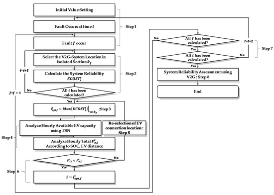 To solve such problems, various studies on ways of improving the reliability are currently in progress and there have been studies on stabilizing microgrids (MGs) and systems and assessing the reliability utilizing vehicle to grid (V2G) in recent years [21,22]. Electric vehicles (EVs) can be considered as portable ESSs, and [23,24,25,26] show studies on reliability assessment with the existing EVs, which use procedures for failure restoration with V2G, EV charge/discharge scheduling and system reconfiguration.